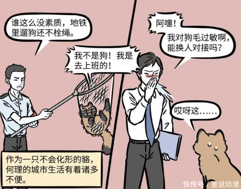 何理原本不会化形,平时上班都会被保安抓住。保安看到何理的形态,会误以为是狗,所以要进入公司的难度很大。何理作为不会化形的貉,也知道在城市生活有多么困难。另外就是对接客户,也会被嫌弃。